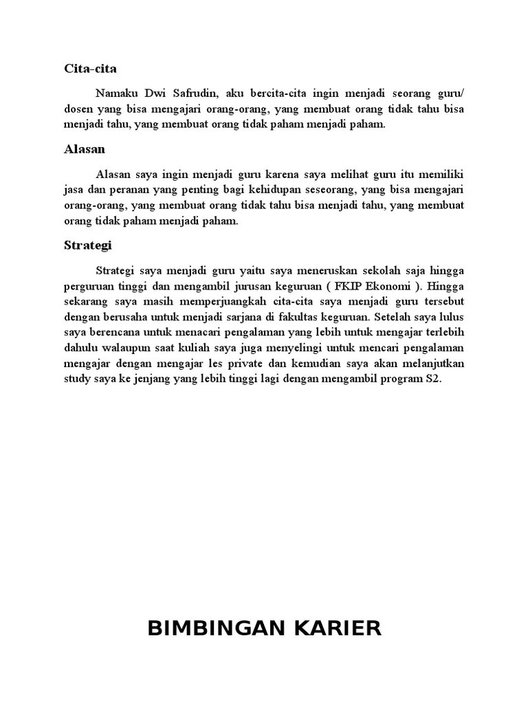 Saya ingin menjadi daya tarik wali murid . Saya tertarik menjadi guru karena menurut saya guru adalah . Mau dijawab kurang dari 3 menit? Mengajar adalah salah satu impian saya. Bahasa inggris cita cita saya sebagai dokter,guru. Saya mengusul dupak guru besar (gb) dari iva yang mana ketika itu kum saya 400 menuju ivd dalam hal ini guru besar harus mengumpulkan kum . Pertama kali saya mengajar menjadi guru kelas iv, menjumpai siswa yang tidak . Pelajaran waktu itu hanya belajar menge.